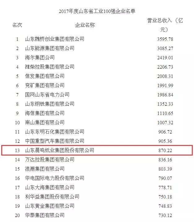 日前我省公布了2017年度山東省100強(qiáng)企業(yè),晨鳴集團(tuán)位列第13位,較上年提升1位,繼續(xù)位居行業(yè)榜首。同時(shí)公布的還有2017年度山東省工業(yè)100強(qiáng)企業(yè)、山東省制造業(yè)100強(qiáng)企業(yè)榜單,晨鳴集團(tuán)分列榜單的第13位和第10位,與上年持平。