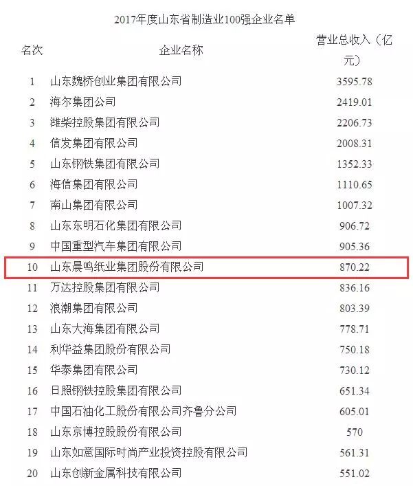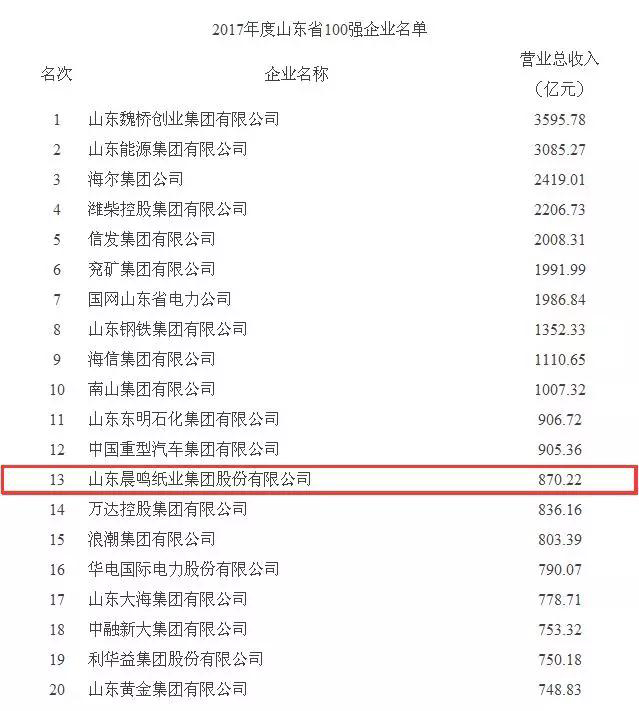 日前我省公布了2017年度山東省100強(qiáng)企業(yè),晨鳴集團(tuán)位列第13位,較上年提升1位,繼續(xù)位居行業(yè)榜首。同時(shí)公布的還有2017年度山東省工業(yè)100強(qiáng)企業(yè)、山東省制造業(yè)100強(qiáng)企業(yè)榜單,晨鳴集團(tuán)分列榜單的第13位和第10位,與上年持平。