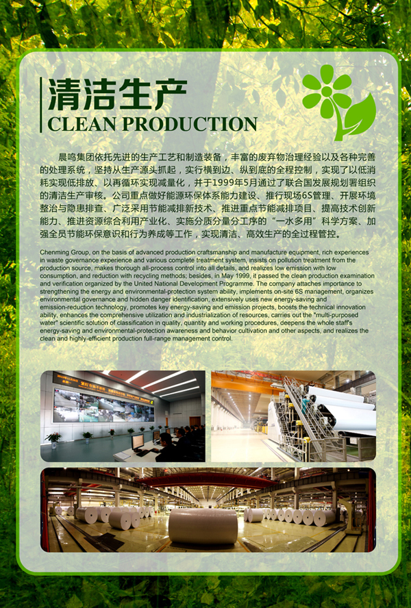 晨鳴集團依托先進的生產工藝和制造裝備,豐富的廢棄物治理經驗以及各種完善的處理系統,堅持從生產源頭抓起,實行橫到邊、縱到底的全程控制,實現了以低消耗實現低排放、以再循環實現減量化,并于1999年5月通過了聯合國發展規劃署組織的清潔生產審核。公司重點做好能源環保體系能力建設、推行現場6S管理、開展環境整治與隱患排查、廣泛采用節能減排新技術、推進重點節能減排項目、提高技術創新能力、推進資源綜合利用產業化、實施分質分量分工序的“一水多用”科學方案、加強全員節能環保意識和行為養成等工作,實現清潔、高效生產的全過程管控。